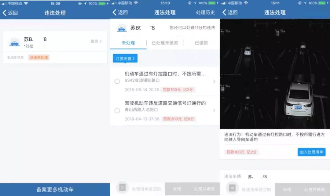 用户选择违法待处理的机动车后,进入未处理违法列表界面,并可点击对应违法记录,查看具体违法内容详情。