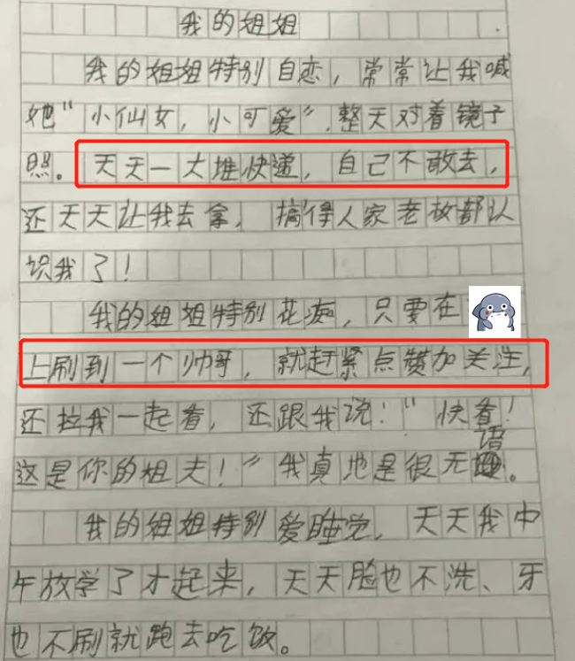 小学生除了写家长外,还会写姐姐,别的小学生写姐姐都是赞扬的话,而这名小学生恰恰相反,没有一句赞扬,反倒是在“黑姐姐”,小学生作文《我的姐姐》,班主任看后笑出鹅叫。