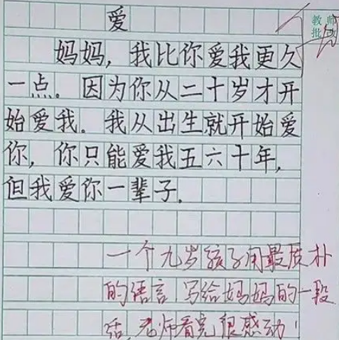 不去对比,永远不知道一名小学生会有多优秀,看完这名9岁小学生的作文后,忍不住泪目,就连班主任都直呼感动,她的标题很简单,只有一个“爱”字,而内容也不啰嗦,只有五行字。