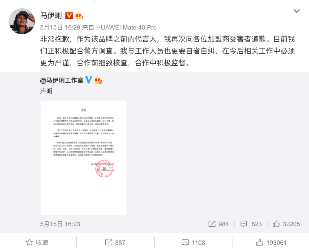 这起“套路加盟”事件,直到茶芝兰代言人马伊琍发布道歉声明,才真正引发热度。
