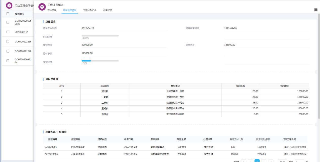 门店工程往往出现现场签证、工程增项的情况,通过申请核准,信息自动关联归集到合同主档。合同总金额会根据增项情况自动叠加,资金执行进度自动更新。