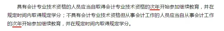 关键词是“次年”,比如我今年才获得初级证,那我明年开始会计继续教育;如果我今年大学毕业从事会计工作,那我明年就得参加继续教育。