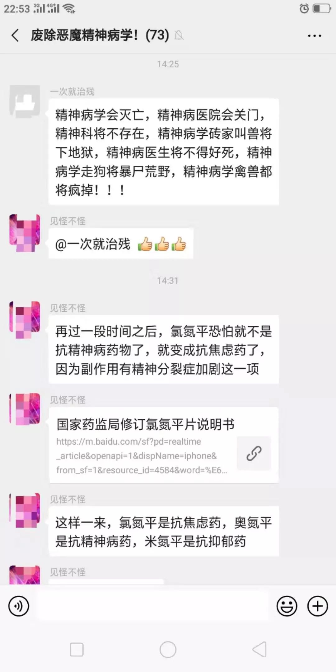她还建了一个群,里面大部分都是被精神病的患者,他们在为自己鸣不平。