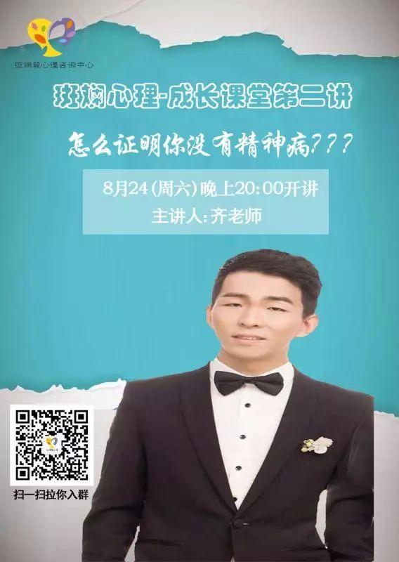 本周六晚上20:00的心理微课堂,由斑斓麓心理首席心理老师,传说中的梗儿君为你带来“怎么证明你没有精神病???”为主题的心理健康知识大普及,欢迎扫码加入。