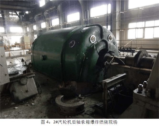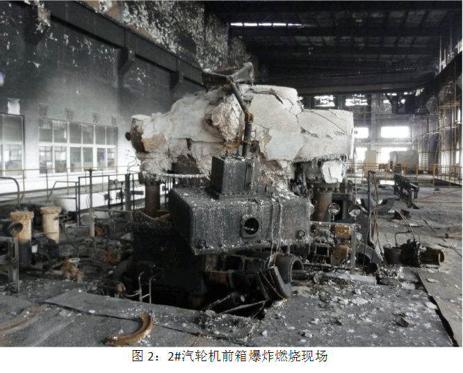 在机组停机过程中,因汽轮机进汽阀门没有正常关闭,造成汽轮机转速失控后严重超速,汽轮机超速时机组剧烈振动,汽轮机转子叶片断裂,发电机定转子碰撞扫膛,轴承金属摩檫产生火花造成轴承箱 内润滑油燃烧爆炸。2号汽轮机前后轴承箱的润滑油燃烧爆炸造成设 备事故范围扩大,火灾殃及相邻的3号汽轮发电机和中央控制室计算 机房等设备。