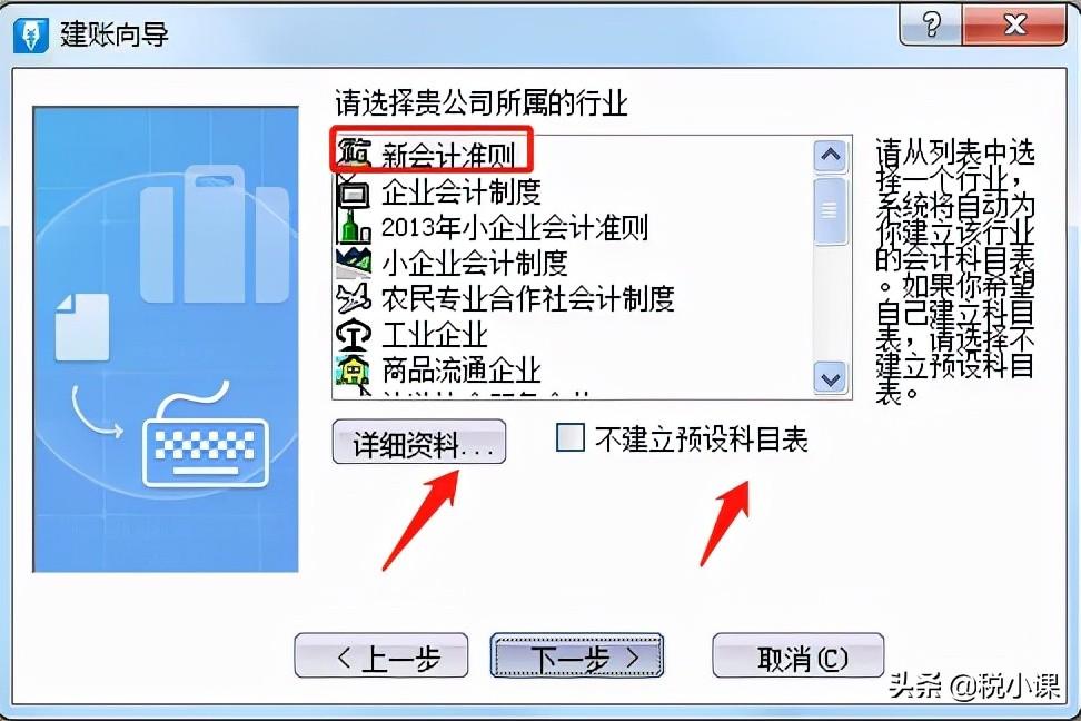 4.设置公司所属行业:请选择公司所属行业”—选【新会计准则】,单击“详细资料”可以查看所选行业模板的预设科目。如果选择的是“不建立预设科目表”,建好账套后没有预设科目。