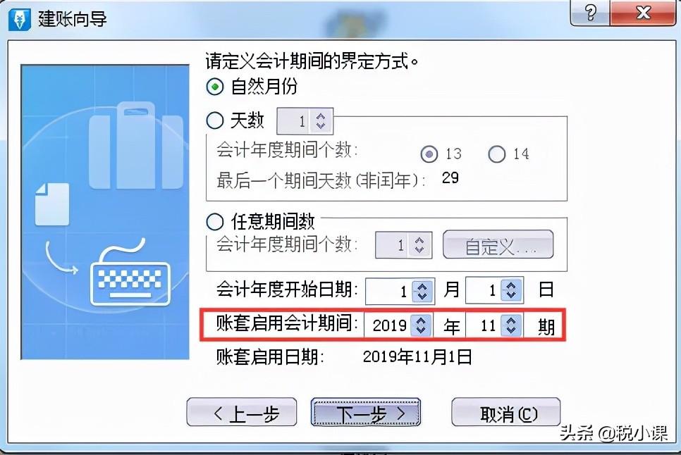 账套启用会计期间:就是用户开始输入数据的年和月。(例如:想从 2019年 11 月份开始录入账务资料,账套启用期间就应该是 2019 年 11 期。会计开始日期大陆地区一般都是 1 月 1 号)