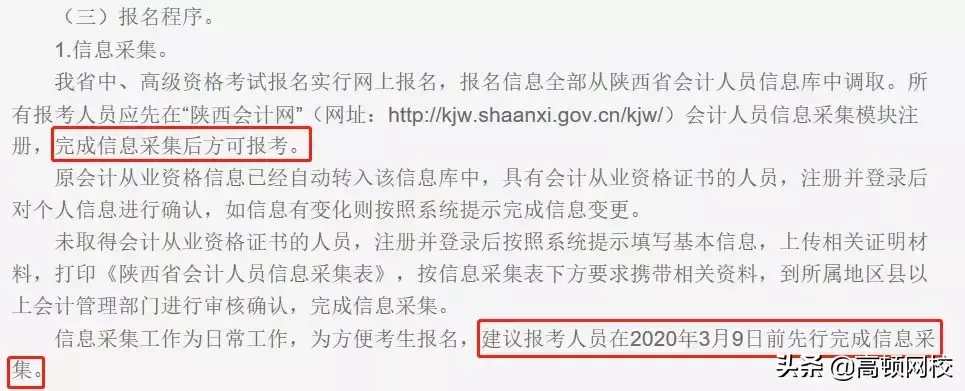 (1)所有报考人员应先在“陕西会计网”(网址:http://kjw.shaanxi.gov.cn/kjw/)会计人员信息采集模块注册,完成信息采集后方可报考。