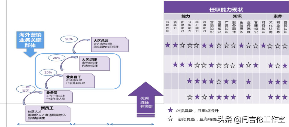 通过对国内外标杆企业调研,海外高管访谈,业务部门梳理培训需求,海外业务人员问卷调查,海外业务人员绩效五个环节的访谈搜集,结合科学的测评工具及能力素质分析工具,搭建海外营销人才能力素质模型。