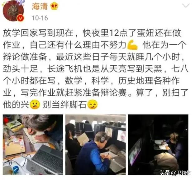 即使坐长途飞机,她的儿子也是自觉做作业,什么数学、科学、历史、地理……从天亮写到天黑,让海清又骄傲又心疼。