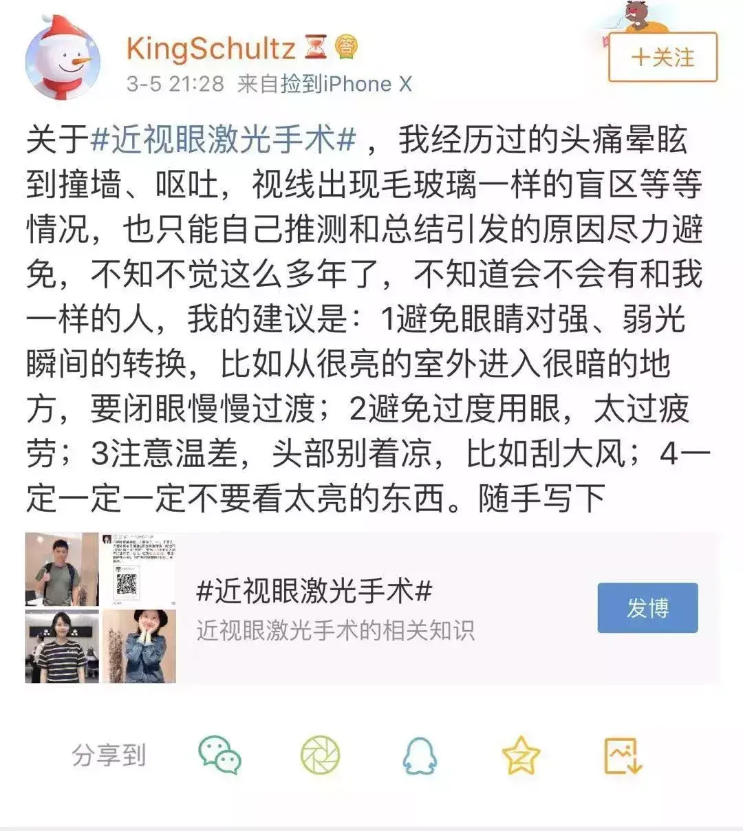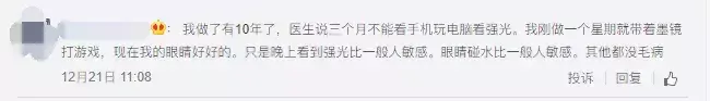 网友:我做了有10年了,医生说三个月不能看手机玩电脑看强光。我刚做一个星期就带着墨镜打游戏,现在我的眼睛好好的。只是晚上看到强光比一般人敏感。眼睛碰水比一般人敏感。其他都没毛病