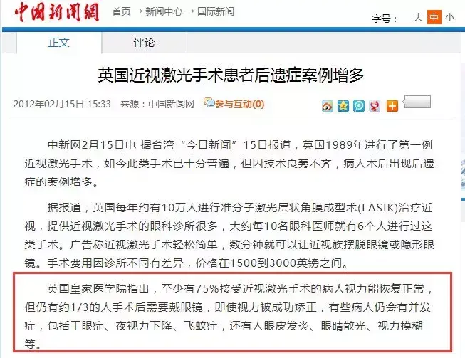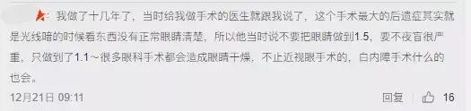 网友:我做了十几年了,当时给我做手术的医生就跟我说了,这个手术最大的后遗症其实就是光线暗的时候看东西没有正常眼睛清楚,所以他当时说不要把眼睛做到1.5,要不夜盲很严重,只做到了1.1~很多眼科手术都会造成眼睛干燥,不止近视眼手术的,白内障手术什么的也会。
