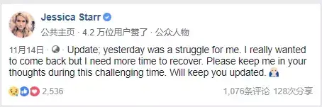 11月13日,她在Facebook直播视频中,提到自己术后恢复艰难。