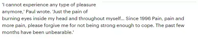 忍受了6年后遗症带来的极度痛苦后选择自杀。