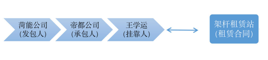 2012年7月28日,菏能公司作为发包人与帝都公司作为承包人签订建筑工程施工合同。2012年8月21日,帝都公司作为甲方(发包方)与王学运作为乙方(承包方)签订承包协议,将前述工程转包给乙方,甲方收取1%管理费。2012年1O月28日,王学运以帝都公司宏盛公司项目部名义与架杆租赁站(个体工商户)签订建筑器材租赁合同,承租方加盖了帝都公司宏盛公司项目资料章。合同签订后袁秀莲、刘中厂按照合同要求将租赁物送往工地。后因拖欠租赁费,袁秀莲、刘中厂起诉帝都公司及王学运要求支付租赁费、赔偿损失并承担违约金。