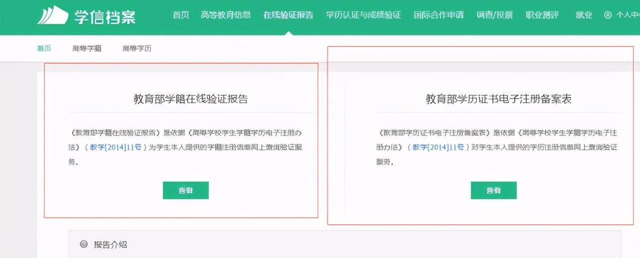 点击进去可以看到学籍在线验证报告和学历证书电子注册备案表。如果你目前是在校,还没有拿到毕业证,只有学籍就可以选择左边的学籍验证,如果是已经毕业的,就可以选择右边的学历证书电子注册备案表。