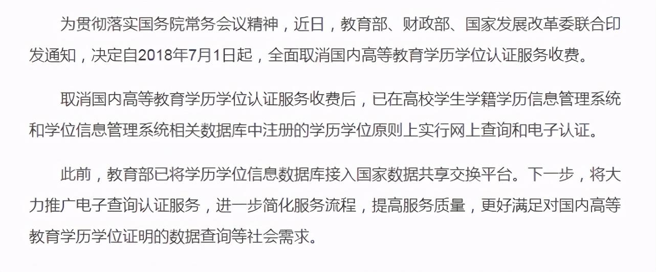 2018年7月1日起,全面取消国内高等教育学历学位认证服务收费。取消国内高等教育学历学位认证服务收费后,已在高校学生学籍学历信息管理系统和学位信息管理系统相关数据库中注册的学历学位原则上实行网上查询和电子认证。