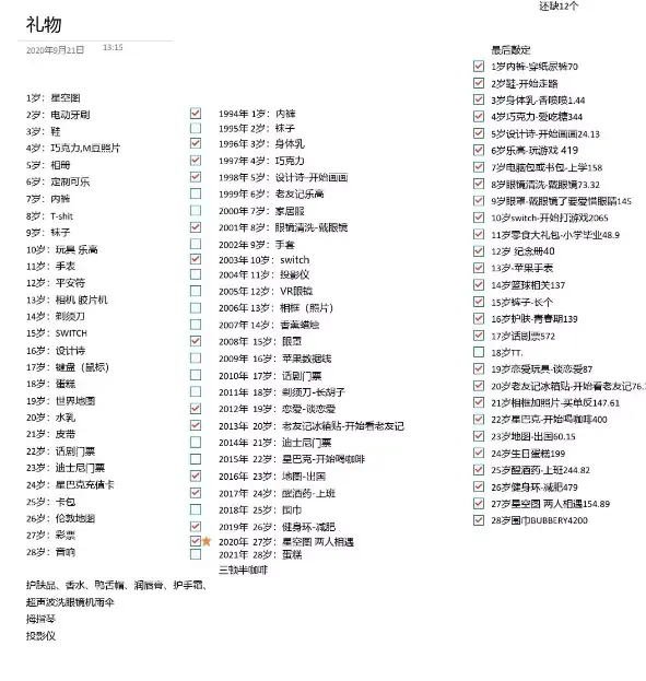 除了这些外,女主还上传了没用上的礼物清单,足足列了一整页。