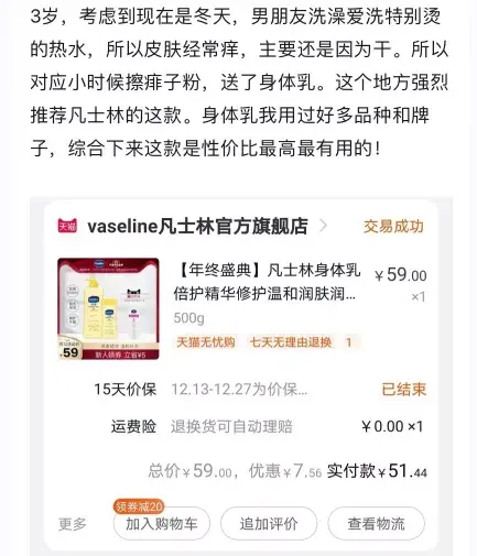 3岁,考虑男朋友洗澡爱洗特别烫的热水,所以皮肤经常痒,于是送了身体乳。