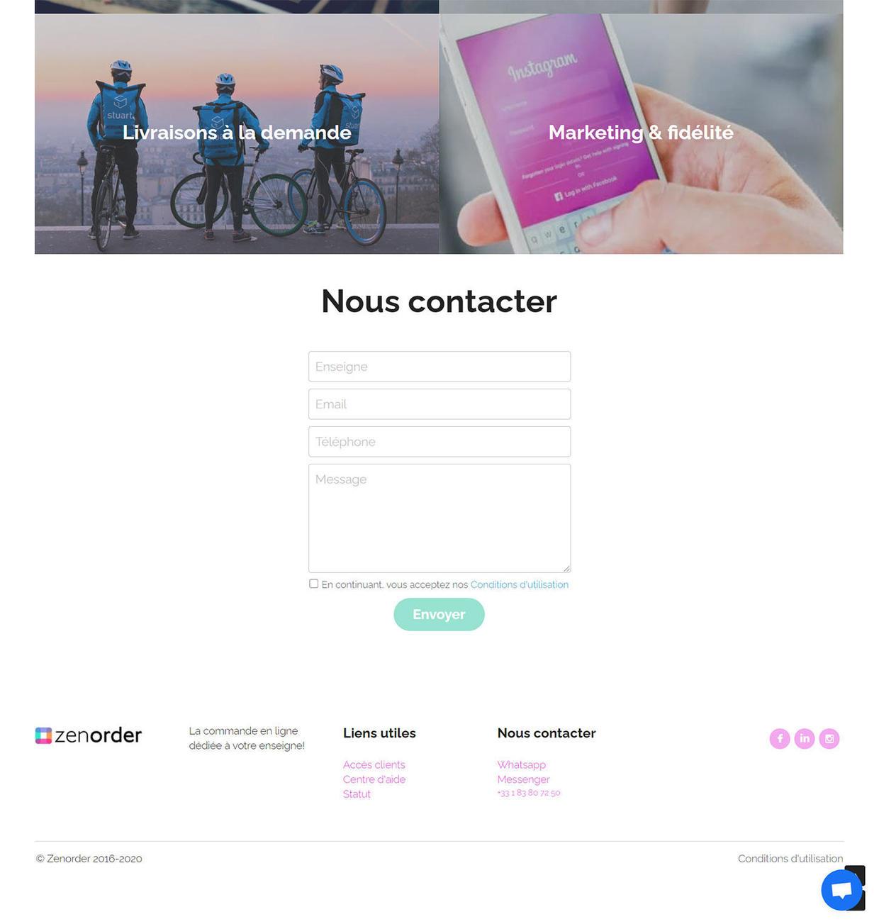 比如下图这个法国餐饮网站,在网站下方添加了留言表单,并且还添加了facebook, linkedin, ins社交媒体按钮,能够引导客户建立联系并关注自己,避免客户流失。