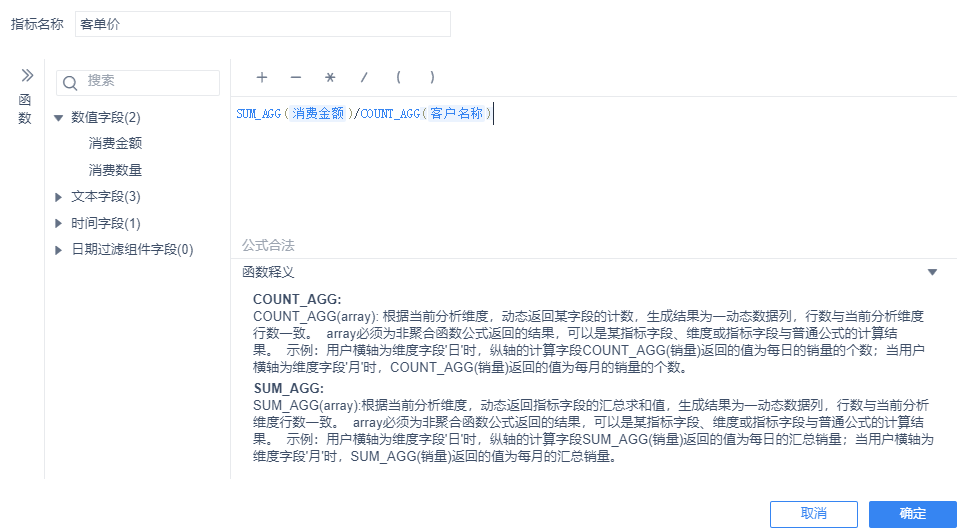 公式:客单价=sum_agg(消费金额)/count_agg(客户名称),这里的难点是聚合函数(_agg)的使用