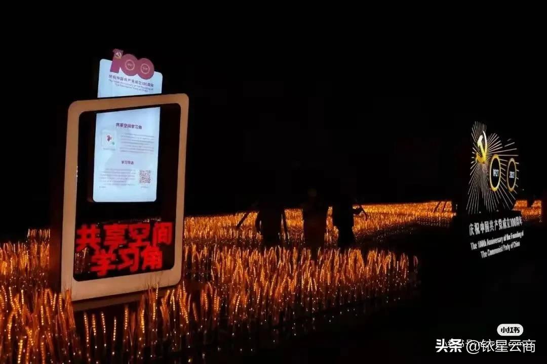 夜幕降临时,金色麦穗灯光亮起,场面熠熠生辉。就着晚风,闭眼便能享受麦浪的惬意与舒适。金色的麦穗灯象征着百年辉煌,寓意建党百年的累累硕果。而红色邮筒象征着党对民心民声的重视。两者相互呼应,相互衬托。