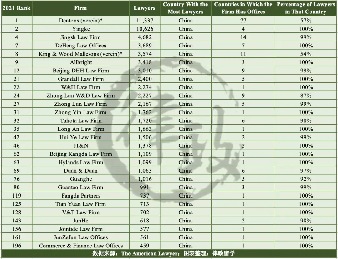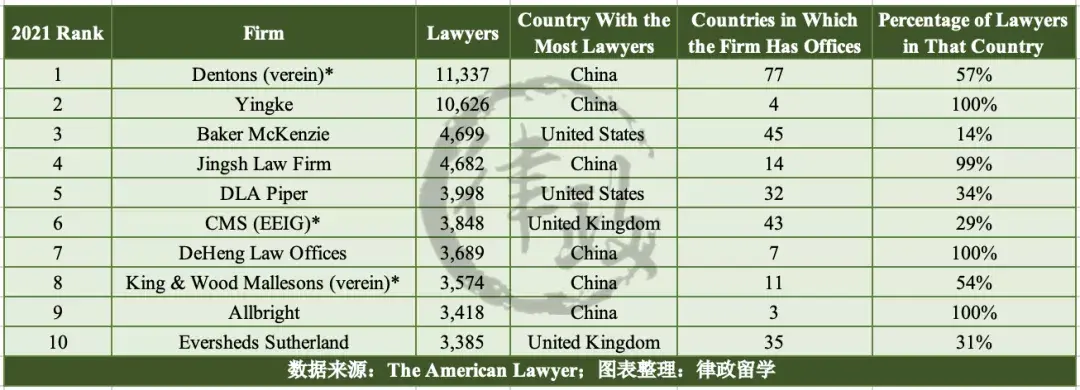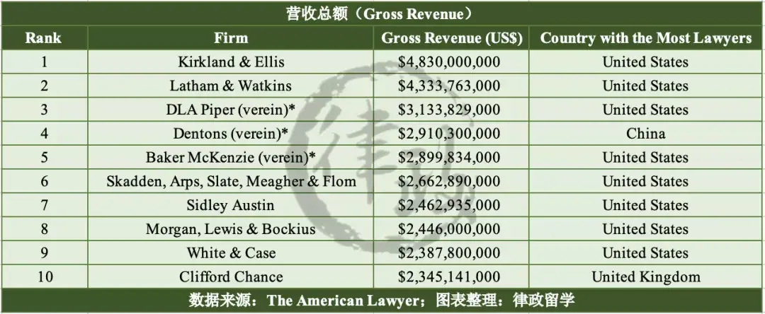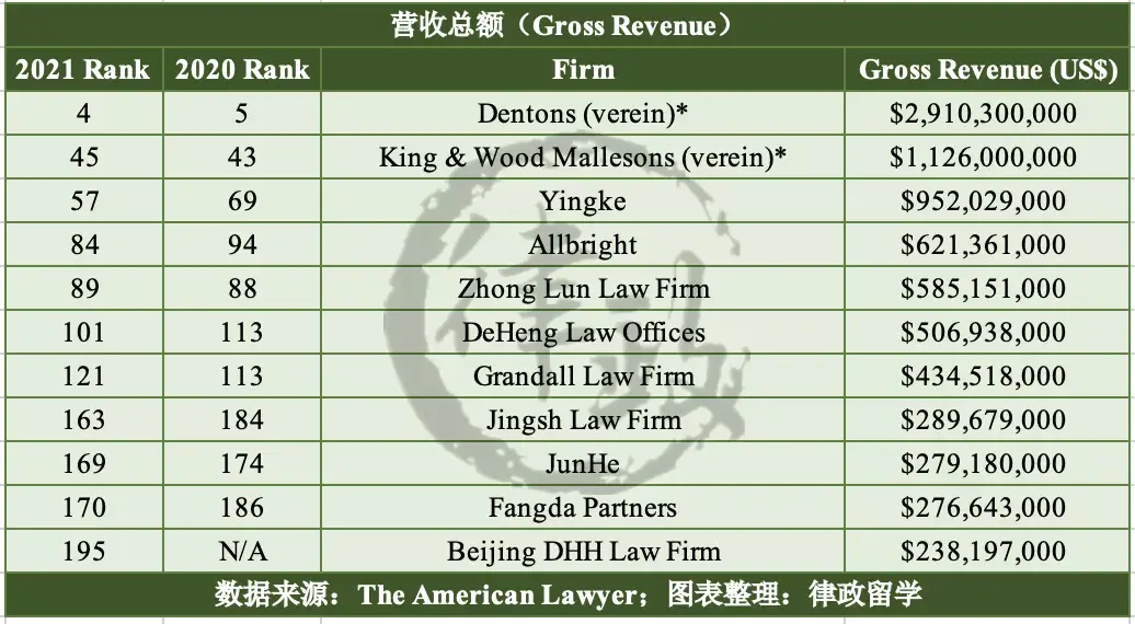 唯一进入前十的中资所是大成律师事务所(Dentons),凭借29.1亿美元的营收排在第4名,表现十分亮眼;前十中另外一家非美国所为总部位于英国的Clifford Chance,其年度营收约23.5亿美元,排在榜单第10名。