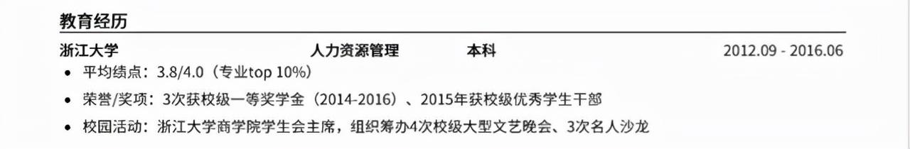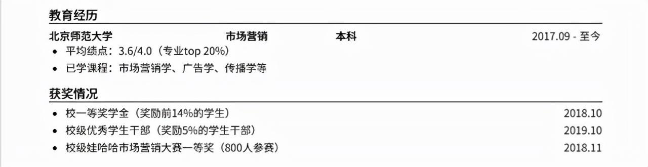 一般的求职简历中,“教育经历”和“获奖情况”往往是合并在一起的,比如这份: