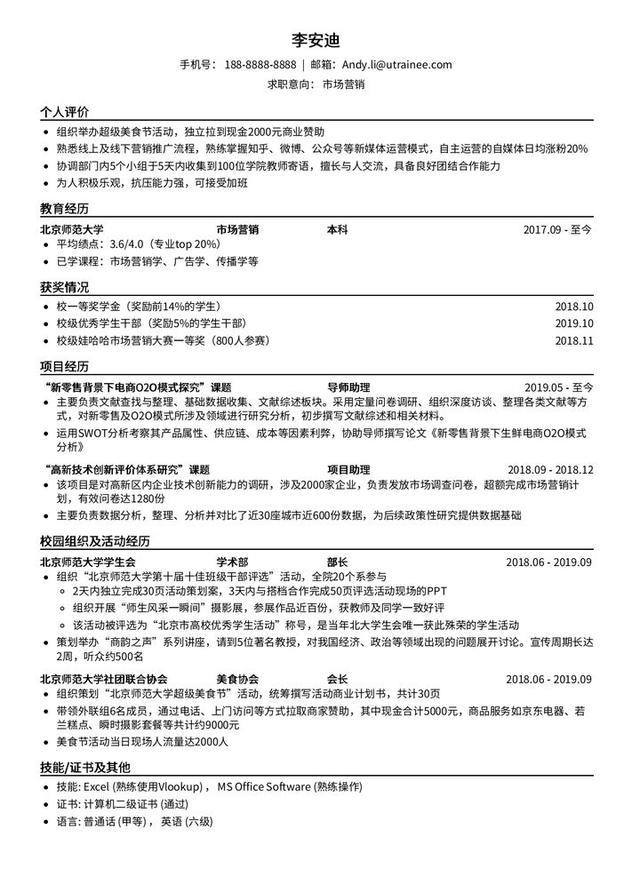 这里有个误区,很多人觉得自我评价是一个很虚的东西,总逃不过自卖自夸的尴尬。写了就跟没写一样,内容总是松松垮垮不尴不尬。但其实,这个尴尬的误区完全是因为你自己不会写自我评价……好的自我评价对于零工作经验的简历来说其实是很加分的,它既可以降低HR筛选简历的成本,也能让HR快速看到你的亮点。