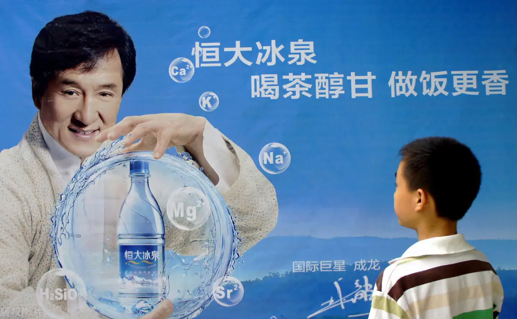 一时间,公交站牌、电视、各大网站都能看到恒大冰泉的广告。在代言人方面也是请的国内外最当红的明星,比如范冰冰、金秀贤、成龙等人都为恒大冰泉代言过。