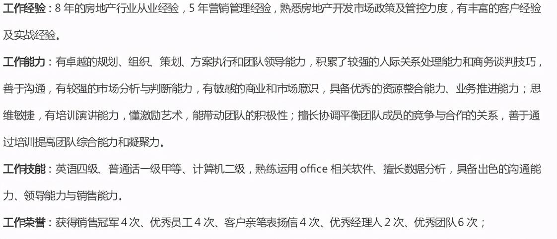 2、个人总结:个人总结放到简历最开始的位置展示,并不是让我们去说“我吃苦耐劳,抗压能力强,学习能力强”等客套话的,而是要用数据说话,表明自己的专业水平,比如说“有七年的从业经历,获得销售冠军X次,完成销售项目XX个”等,任何没有数据的自夸都是耍流氓的行为,只有数据才能吸引HR的眼睛,成为最优秀的候选人。