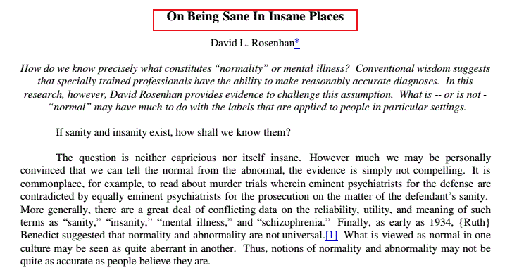 当罗森汉恩整理完所有资料,在1973年把这些成果写成“On being sane in insane places”论文,将其发表在美国著名的《科学》杂志上的时候,美国,乃至世界的精神病学界都被狠狠打脸,因为罗森汉恩的论文揭示了这样一个问题:当一个人被打上“精神病”的标签,就很难清除,是整个精神病学界的失职。