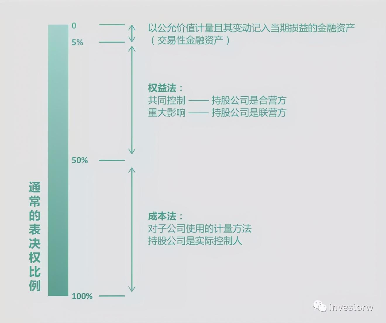 其次判断表决权比例,通常表决权比例对应的核算方法见下图: