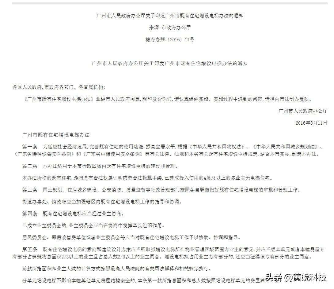 关于广州既有住宅加装电梯还有一个专门的地方性发怪即《广州市人民政府办公厅关于印发广州市既有住宅增设电梯办法的通知》。根据该通知第五条规定第五条 既有住宅增设电梯的意向和建筑设计方案应当听取拟增设电梯所在物业管理区域范围内业主的意见,并应当经本单元或者本幢房屋专有部分占建筑物总面积2/3以上的业主且占总人数2/3以上的业主同意。增设电梯拟占用业主专有部分的,还应当征得该专有部分的业主同意。