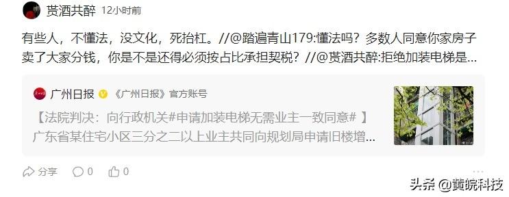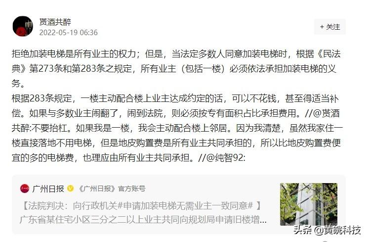 接着这位退休老头给出了这样一条法律依据:拒绝加装电梯是所有业主的权力;但是,当法定多数人同意加装电梯时,根据《民法典》第273条和第283条之规定,所有业主(包括一楼)必须依法承担加装电梯的义务。根据283条规定,一楼主动配合楼上业主达成约定的话,可以不花钱,甚至得适当补偿。如果与多数业主闹翻了,闹到法院,则必须按专有面积占比承担费用。//@贳酒共醉:不要抬杠。如果我是一楼,我会主动配合楼上邻居。因为我清楚,虽然我家住一楼直接落地不用电梯,但是地皮购置费是所有业主共同承担的,所以比地皮购置费便宜的多的电梯费,也理应由所有业主共同承担。