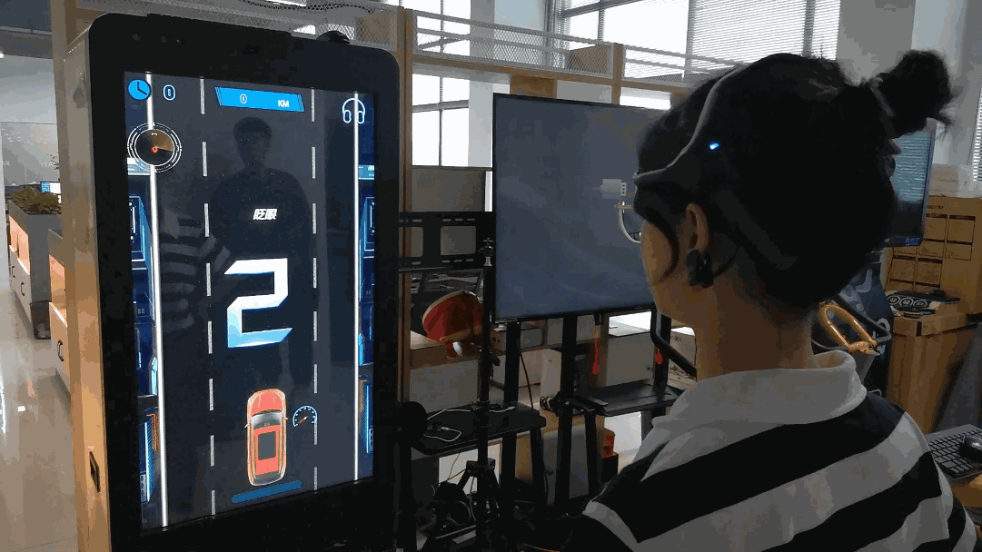 互动方式:玩家戴上脑波仪,进入游戏,注意力越集中,小车前进的速度就越快。并且玩家可以通过屏幕提示眨眼来加速和躲避障碍。有这么炫酷的黑科技加持,汽车展示瞬间高大上了不少!