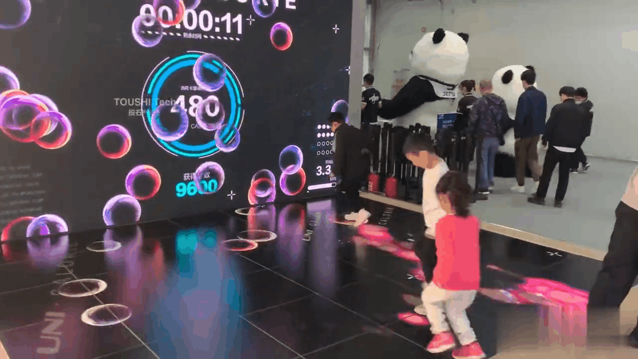 互动方式:地面雷达互动,同时支持多位玩家参与游戏,玩家们互动区域的地面上不断地踩“破”地面上的泡泡,并且会有一连串的特效泡泡跟随着玩家的脚步绽放。在限定时间内踩“破”的气泡越多分数就越高。
