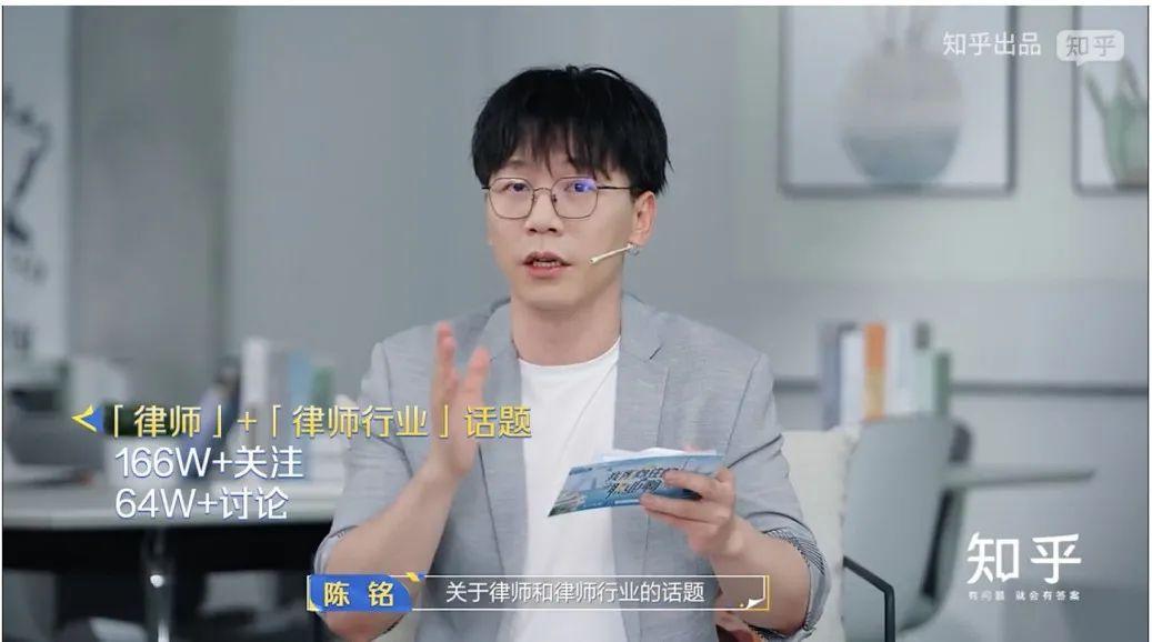 比如在《我所向往的职业啊》,选择竞天公诚律所的 90 后律师李龙宇作为纪录对象,就是因为在知乎上「律师」+「律师行业」话题,有 166W+ 关注和 64W+ 讨论。