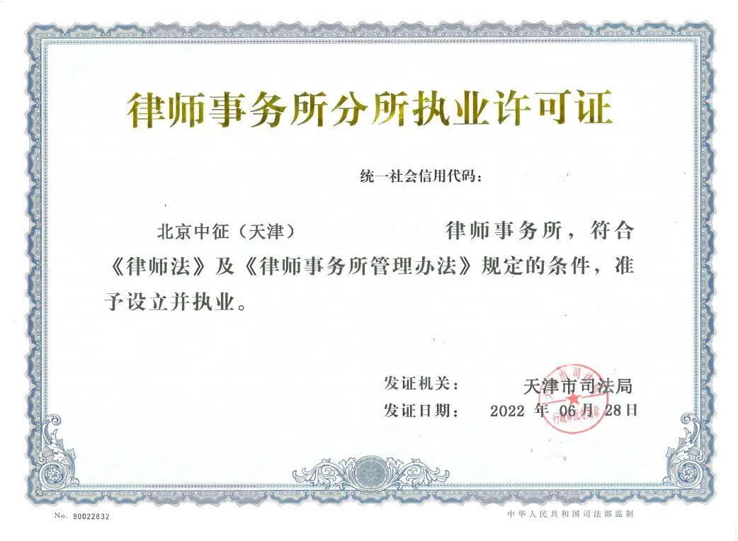 2022年6月28日,经北京市司法局、天津市司法局批准,北京中征律师事务所天津分所(以下简称“中征天津分所”)执业许可获批通过,北京中征(天津)律师事务所正式设立。