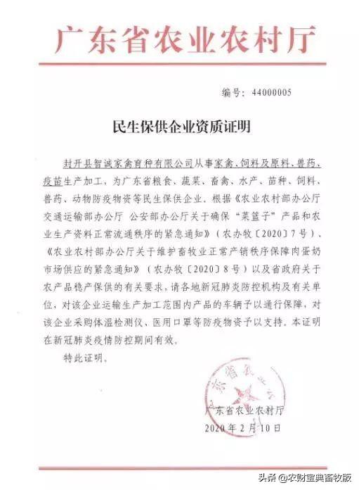 广东省养猪行业协会会长陈三有研究员接受农财宝典记者采访时介绍,面对新型肺炎疫情防控的严峻局面,为保障“米袋子”、“菜蓝子”和“果盘子”等民生保供工程,农业农村主管部门会同有关部门联合出台了一系列保供稳价安心的政策措施,发挥了应有的积极作用。但由于政策贯彻执行存在着一定的滞后性,特别是面对返工潮疫情防控的空前压力,一些地方的防控措施也是空前严厉,因此应部分承担民生保供企业的迫切要求,广东省农业农村厅特事特办,为其开具《民生保供企业资质证明》,以解决其在生产、运输、销售农产品及投入品等节点上碰到的新难题新堵点。