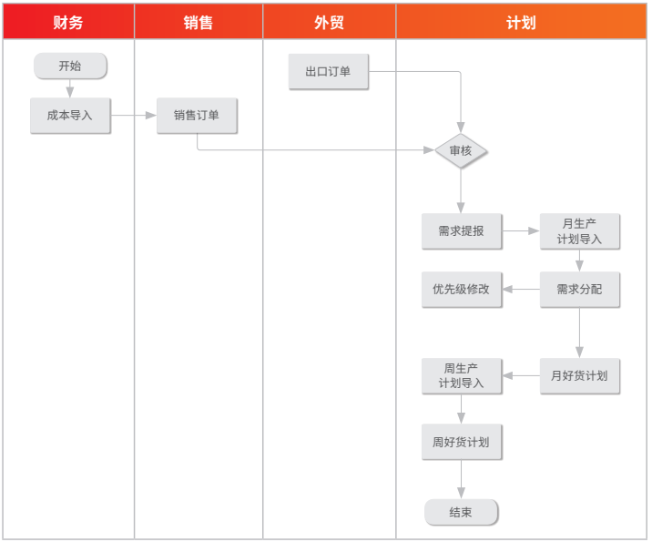 根据 U8+内贸销售订单和外贸销售订单中客户重要程度、产品毛利率等内容,对重点客户及毛利率高的订单优先排产,自动编制月生产计划和周生产计划,为企业创造最大生产价值,排产流程如下图: