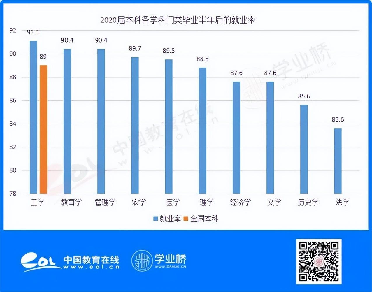 据《2021年中国本科生就业报告》显示,2020届法学类学生毕业半年后就业率为83.6%,在各学科门类中排名靠后,且低于全国本科的就业率(下图)。