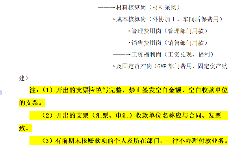 根据付款审批单(计划内费用经相关岗位审核,计划内10万元以上或计划外费用经财务部长或财务总监审核)审核调节表中无该部门前期未报账款项——→开具支票(汇票、电汇)——→登记支票使用登记本——→将支票、汇票存根粘贴到付款审批单上(无存根的注明支票号及银行名称)——→加盖“转账”图章——→登记单据传递登记本——→传相关岗位制证