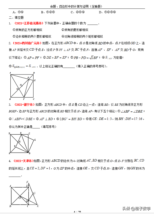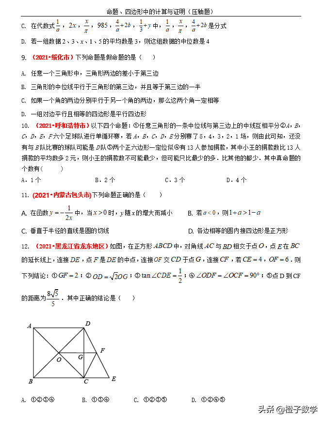 1. (2021•湖南省衡阳市)下列命题是真命题的是( )