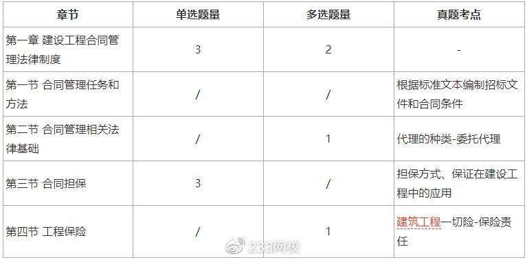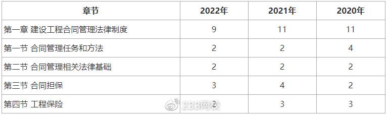 第一章建设工程合同管理法律制度共4个小节,近2年的分值情况是11分,考查单选题和多选题。2022年分值降低,考查了6个题目,3个单选题和3个多选题,共计9分。