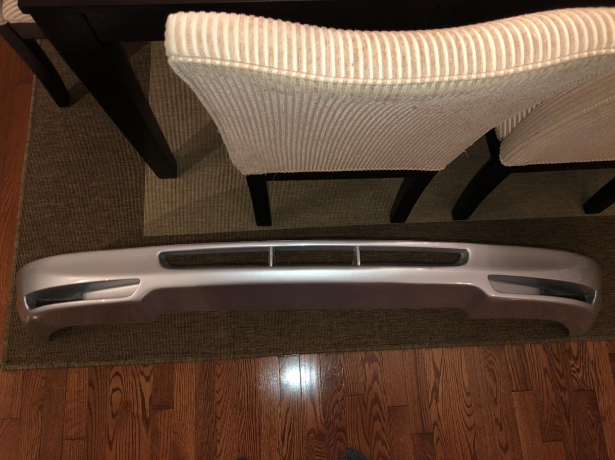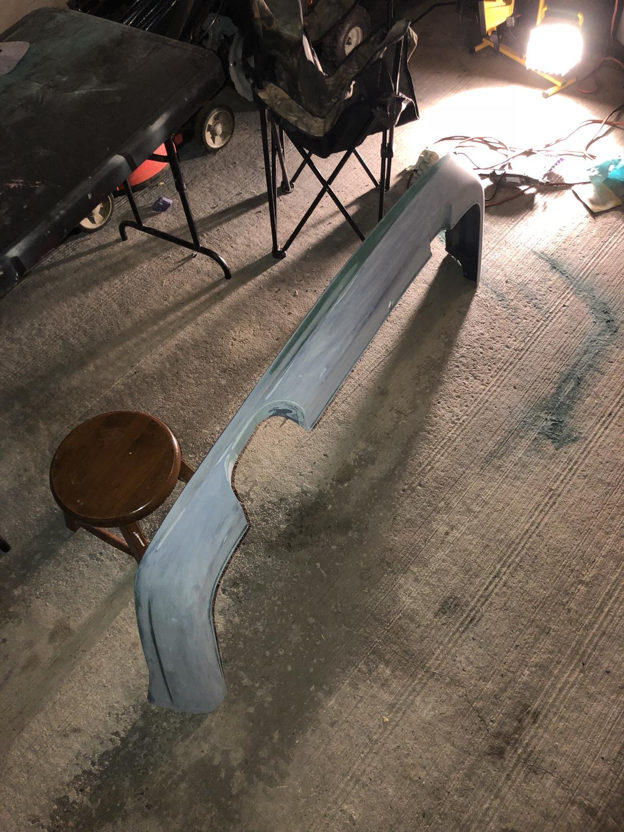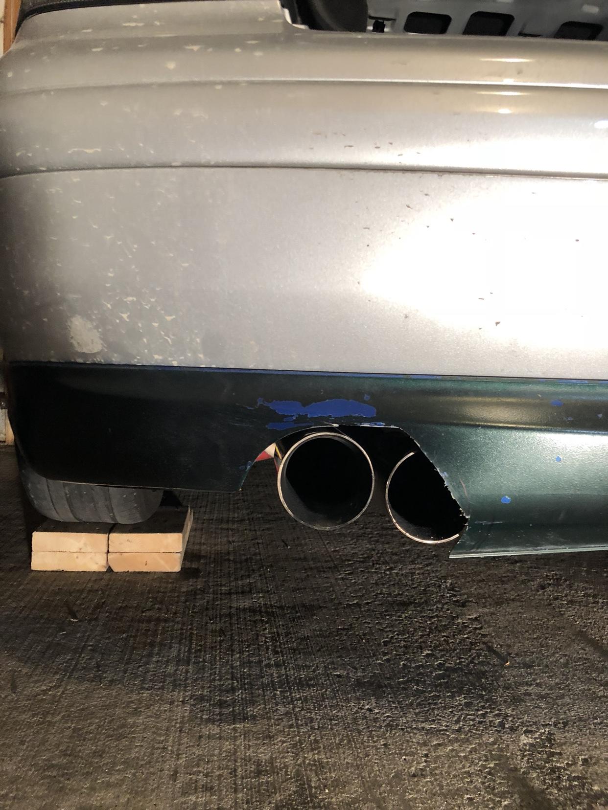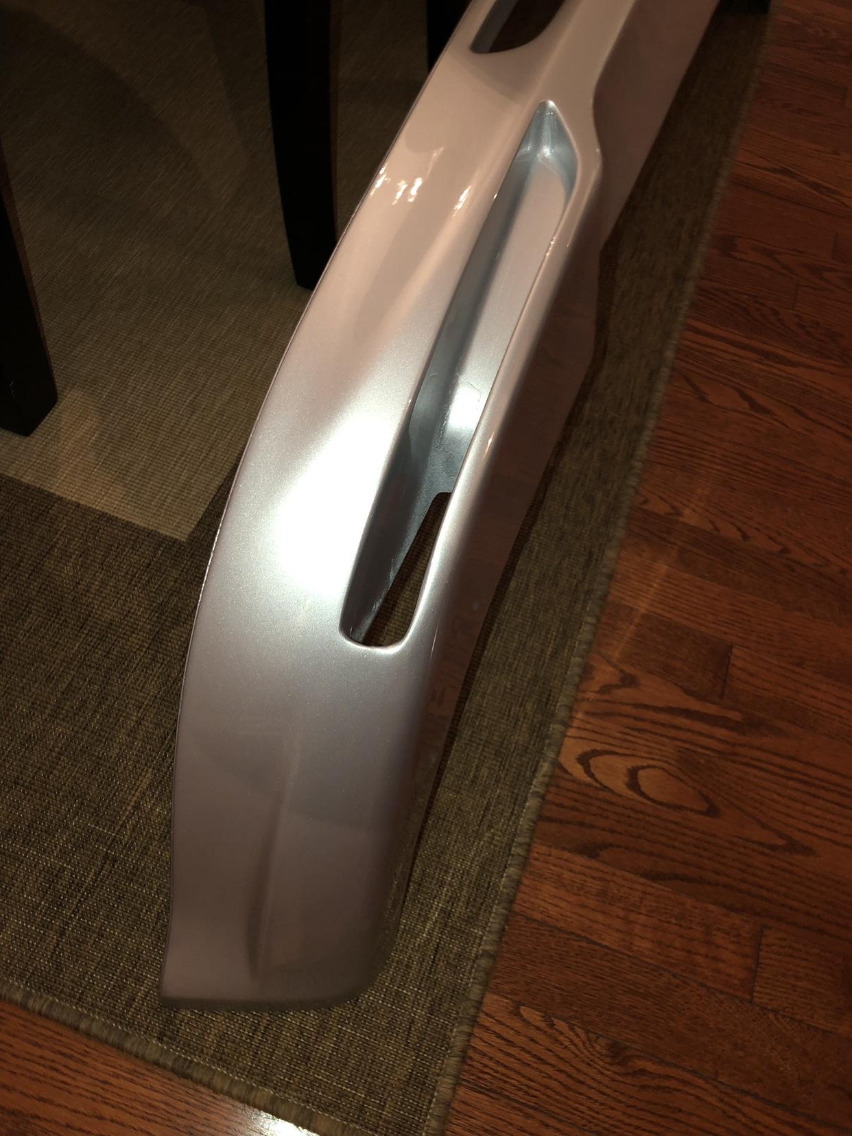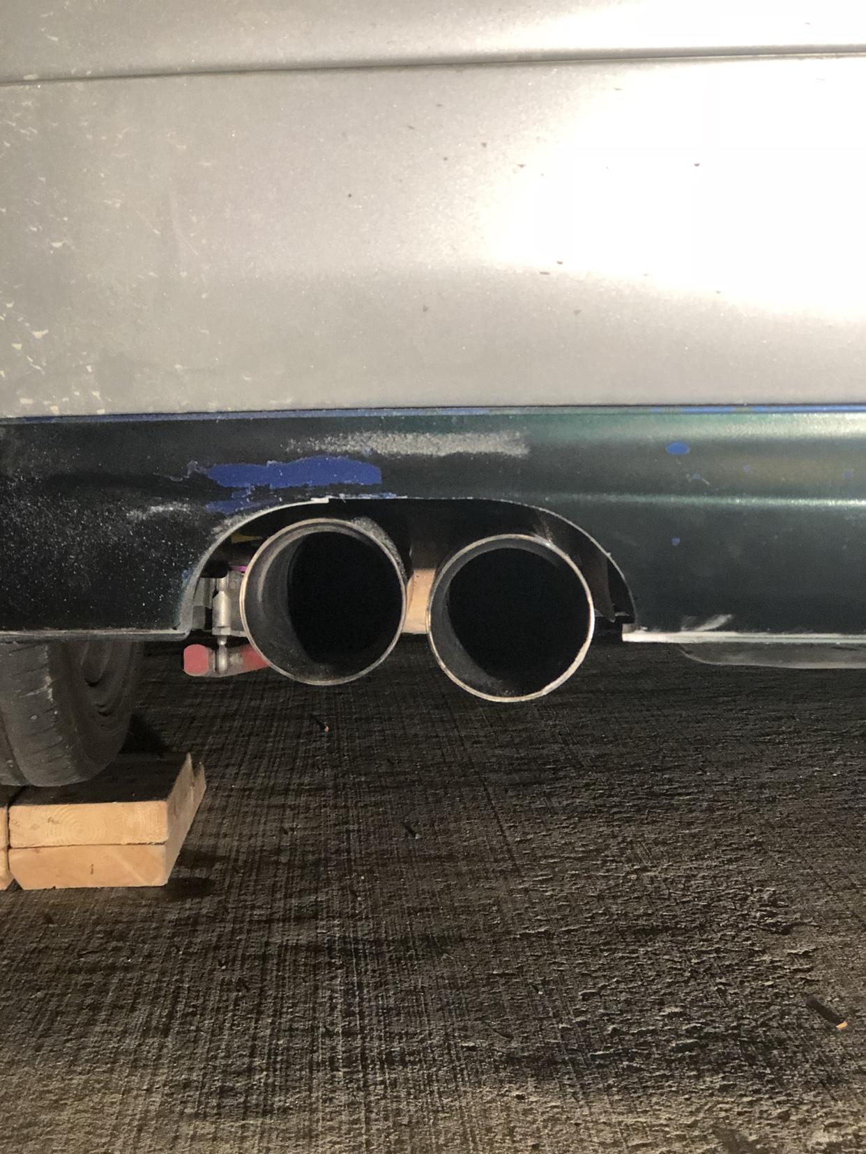 经过数小时的打磨之后,整个尾唇已经打磨好了,准备开始上油漆之前,我装车试了试契合度,还不错,两个尾喉的高度不相同,但通过调整能够让其水平。