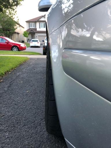 一段时间后,我买入了所需的零件,前部加上了10mm的垫片,最终偏移量+25。后部开始用18mm垫片,结果轮毂突出略多,后尝试了15mm,偏移量控制在+20,正正好好。轮胎打算选择215/31/R18规格,拉伸之后更扁,尽可能减少摩擦的风险。