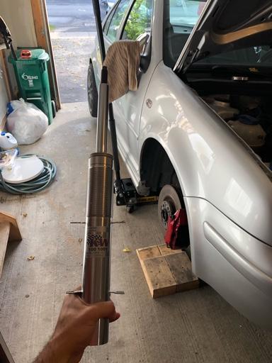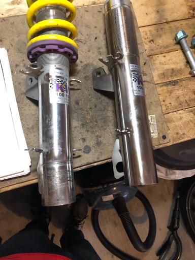 一整个夏季过得非常开心,赛道聚会没少去。然而又一次突然发现,右侧前轮的负角度有些异常,拆开后发现避震筒出现了弯折,我立即联系KW,经过一系列测量和照片后,他们兑现了保修,给我了一根新避震!