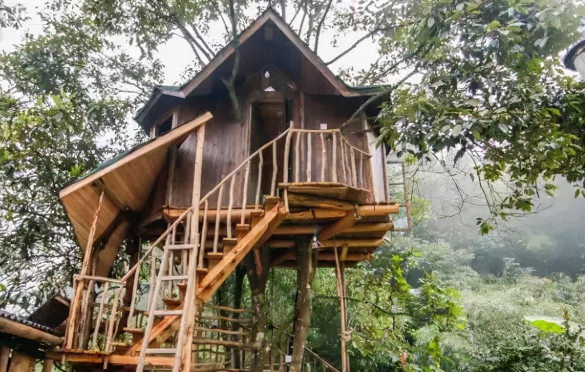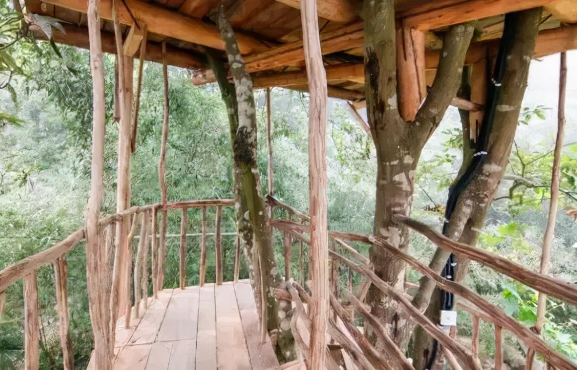 上图是“树屋”,取名叫青材,最初想做树屋也是因为面积小,树屋可以架空建造,所以建好后树屋是完全是架在树上面的。这个树屋开始建的时候,是打算做个书房,现在建好了以后发现里面空间还是蛮大的,就把卫生间放进去。