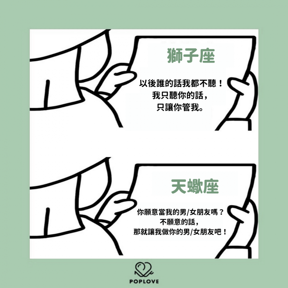 习惯了成为领导者的狮子座,无时无刻都想成为人群中的焦点。在他们的人生从来都是只有指挥别人,如果有一天狮子宝宝愿意让你管着他,那就是陷入爱情了吧~就算告白也一样霸气,还有一点反差呢!霸道式的告白有谁受得了啊~